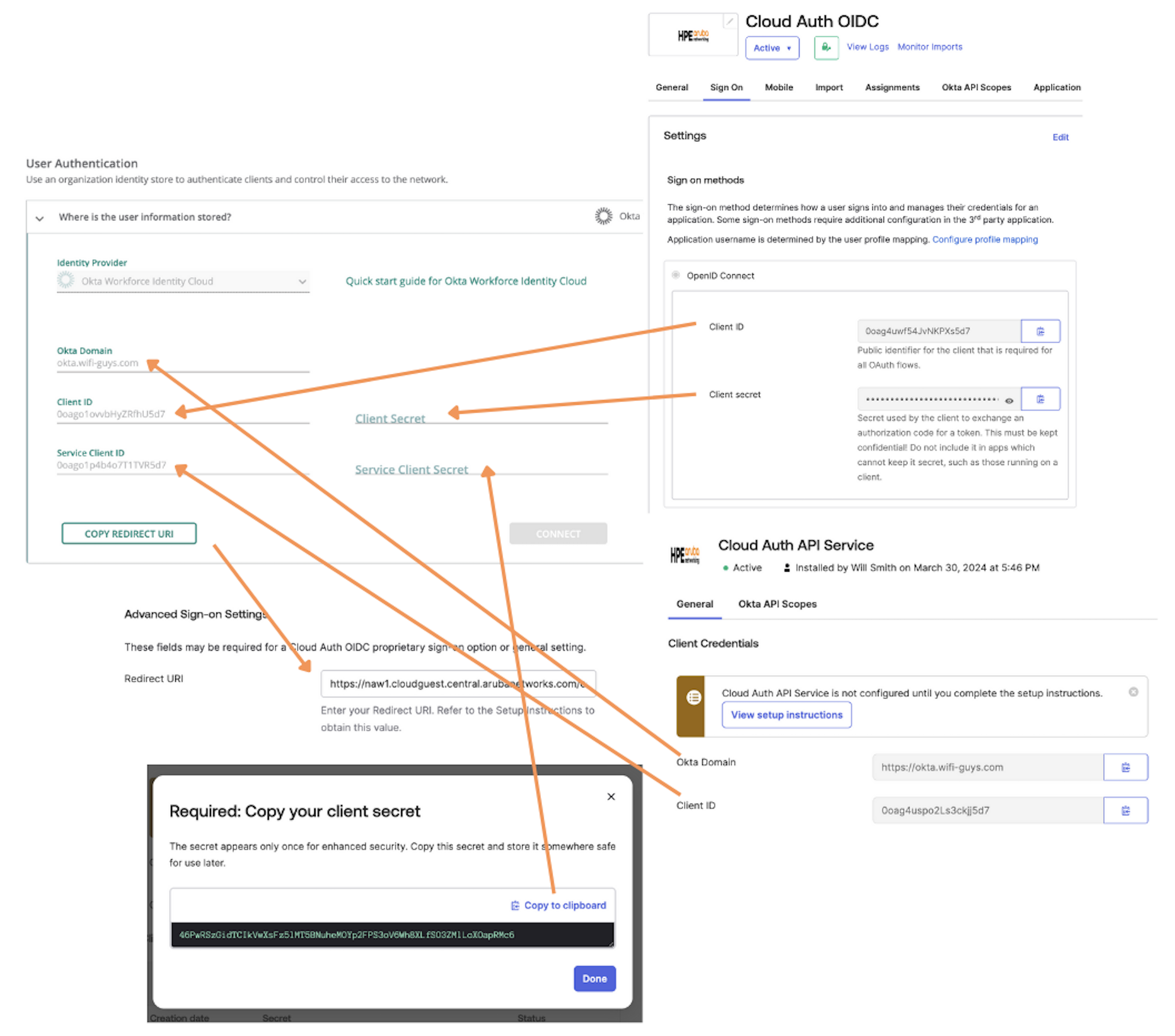 Please review the Cloud Auth configuration overview: https://www.arubanetworks.com/techdocs/central/2.5.8/content/nms/policy/config-cda-in-okta.htm?Highlight=okta