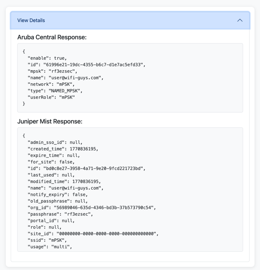 The tool eliminates the need to manually recreate accounts and passphrases when users require consistent mPSK access across both platforms. It ensures accounts are created once and mirrored accurately, reducing administrative effort and preventing inconsistencies in hybrid ArubaโMist deployments.